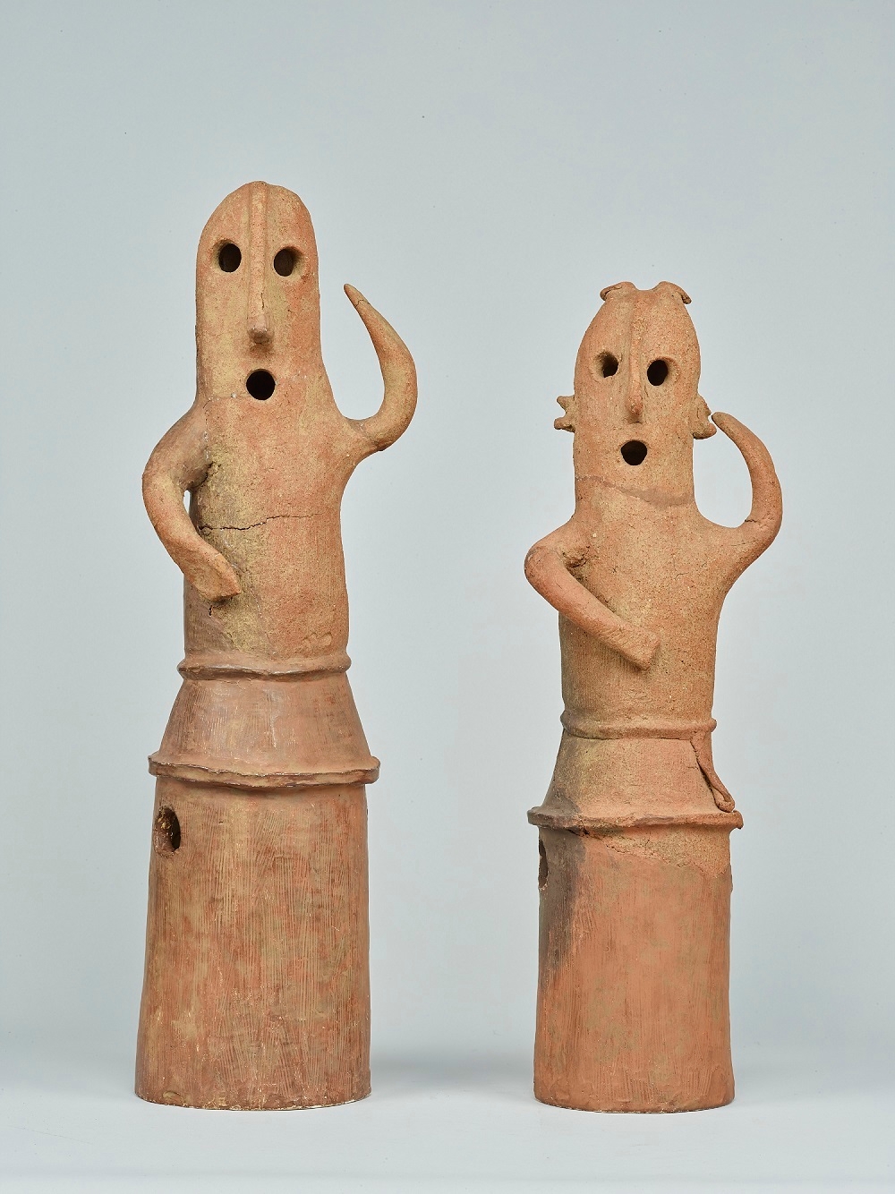 小さい方の埴輪は、腰に鎌を着け、顔の両脇で髪を結って束ねる美豆良(みずら)という男子の髪型をしています。一方、大きい方の埴輪にはその特徴がみられず、男女のどちらかよくわかっていません。ただ、女子の埴輪によくみられる胸部や服飾の特徴的な表現がないことから、男子の埴輪であるとも考えられています。衣服や武具、アクセサリーを身に着ける埴輪も多くありますが、この作品はどちらの衣装も帯のみと大胆にデフォルメされています。この素朴さ、そして生き生きとした動きが作品の魅力でもあるのではないでしょうか。