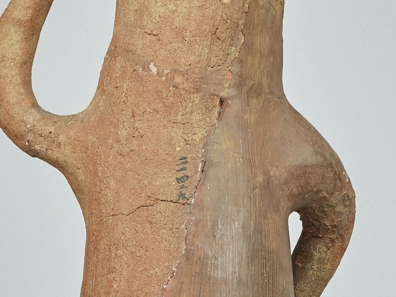 胴や腕の部分に横向きの亀裂が複数みられます。また、過去の修理による石膏が経年劣化し、一部に剥離が生じている状態です。東京国立博物館の所蔵する埴輪の中でも知名度の高い作品であることから、他施設から貸出し依頼の多い作品ですが、慎重な取扱いを必要とするため、断念せざるを得ない状況です。