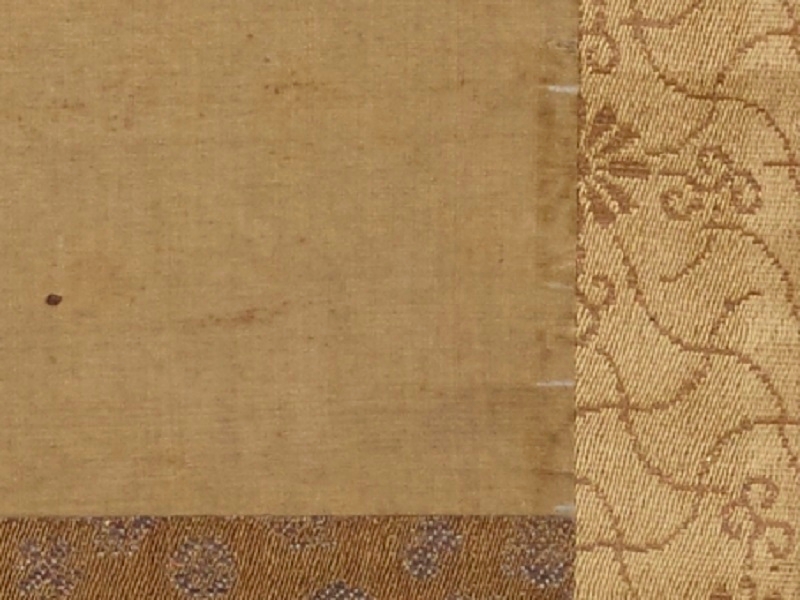 ▼本紙と表装裂(ひょうそうぎれ)(織物)の重なる部分に折れや擦れがみられる
