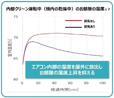 運転停止後に行う乾燥運転「内部クリーン」時に排気換気が連動し、部屋への湿度戻りを軽減