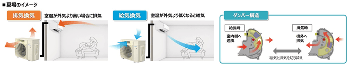 新モデルの本商品は、室外機に新たに搭載した「ダンパー構造」と「高静圧ターボファン」により、給気と排気の換気方式を切り替えることが可能です。排気換気に切り替えることで、室内を換気しながら不快な熱や湿気を屋外に排出できます。