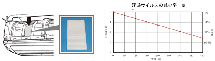 フィルターに付着したものを抑制します。実使用空間での実証効果ではありません。