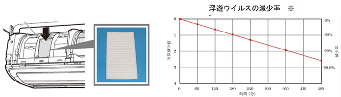 「抗ウイルスフィルター」と「ストリーマ空気清浄運転」で、室内の浮遊ウイルスを抑制