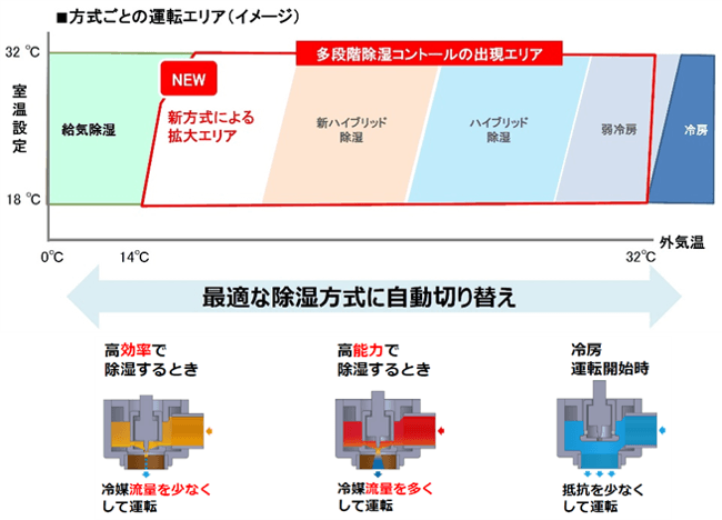 本商品は、気温や湿度に応じて必要な除湿量を小容量から大容量までリニアに制御できる「多段階電子膨張弁」を業界で初めて室内機に採用しました。これにより、夏場の除湿量が大幅に増加するとともに、外気温度が14℃の涼しい日の快適な除湿運転までを可能にします。「さらら除湿(リニアハイブリッド方式)」は、年間を通じた除湿ニーズに対応し、快適な湿度環境を実現します。