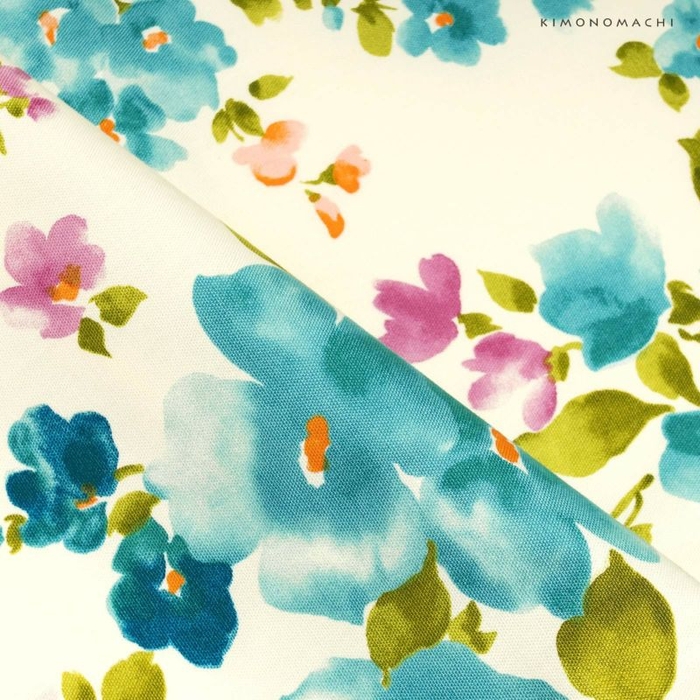 やや黄みの白色地に、ブルー、淡い橙色、赤紫色などの色使いの水彩画のようなお花模様。ターコイズ系のブルーが爽やかでおしゃれな印象です。