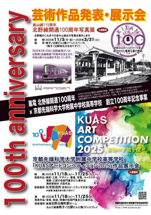 合わせて、沿線の京都先端科学大学附属中学校高等学校が本年5月15日(木)に創立100周年を迎えたことから、同校との芸術をテーマとした100周年記念事業として、11月3日(月・祝)から帷子ノ辻駅ビル内で、北野線の歩みを写真やパネルで振り返る写真展を実施、また11月18日(火)から「『KUASアートコンペティション※』創立100周年企画展」の入賞作品を収めた映像を帷子ノ辻駅ビル商業施設「ランデンプラザ帷子」と北野白梅町駅で上映します。