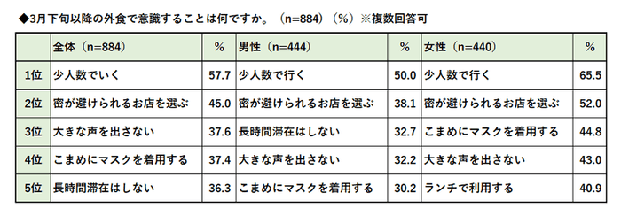 “外食予定で意識すること”について、ぐるなび会員を対象に3月下旬以降の調査でも、男性・女性共に1位「少人数で行く」、次いで「密が避けられるお店を選ぶ」という結果となり、こじんまりとした少人数向けのお店が求められていることがわかります。