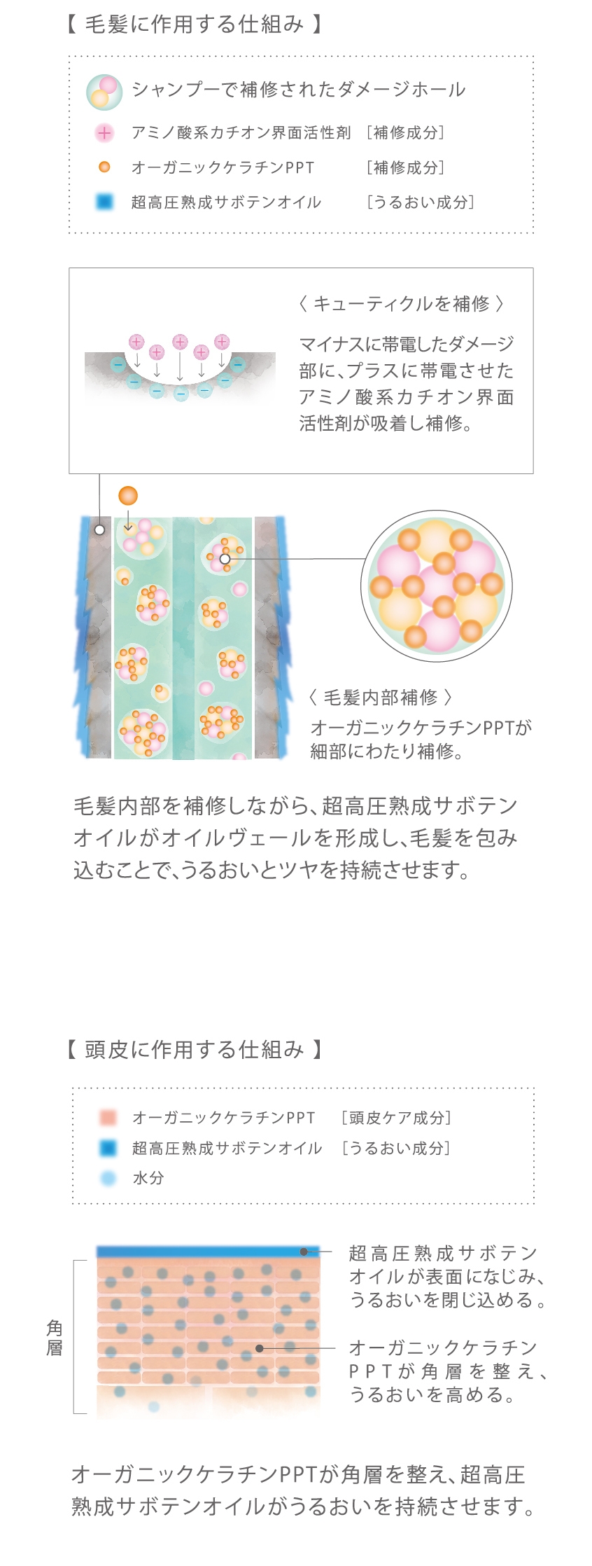 アミノ酸のひとつであるアルギニン由来のカチオン界面活性剤を採用することにより、キューティクルのダメージを集中的に補修します。