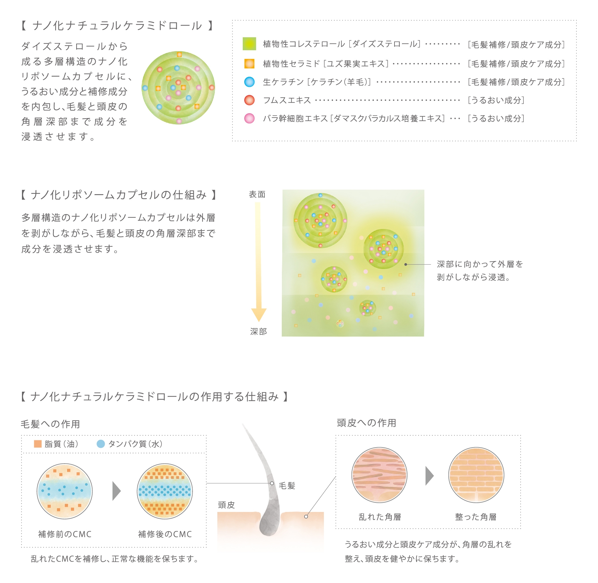 コタオリジナルナノ化CMC一体化ユニット「ケラミドロール」の成分を、サスティナブルな植物由来に置き換え、頭皮ケア成分を加え進化させた、コタオリジナルナノ化リポソームCMC一体化ユニット「ナノ化ナチュラルケラミドロール」。毛髪の補修、頭皮の保湿とバリア機能を助ける成分を内包した、ナノ化リポソームカプセルが、毛髪と頭皮の角層深部まで成分を届け、しっかりと浸透し作用します。