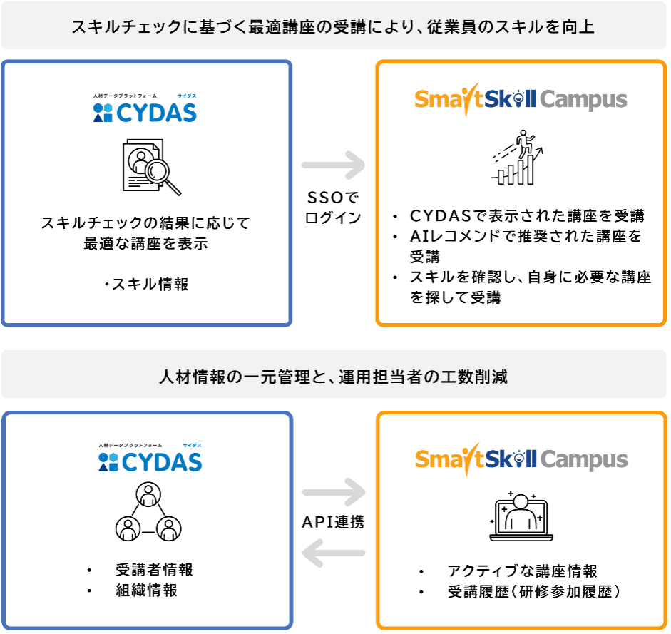 【リスキリング加速へ】スキルチェック結果に基づいた最適講座をレコメンド!タレントマネジメントシステム「CYDAS」と学習管理システム「SmartSkill Campus」が連携