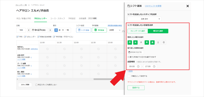 アップデートにより、曜日ごとのシフトを繰り返し登録できるようになりました。