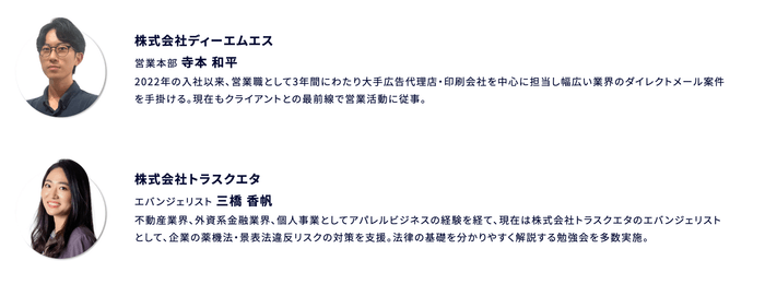 広告表現チェックツール「TRUSQUETTA」を提供する株式会社トラスクエタ(本社:東京都渋谷区、代表取締役CEO:高橋 聡)は、年間3.5億通以上のDM発送実績を有する株式会社ディーエムエス(本社:東京都千代田区、代表取締役社長:山本 克彦、東証スタンダード市場:証券コード9782) と共催で、「プロが教える !DM発送における郵便ルールと広告規制解説セミナー」と題したセミナーをオンラインにて開催します。