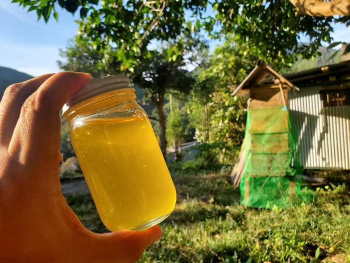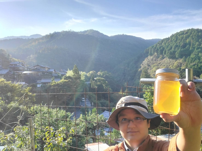 京都市右京区の高雄地区でニホンミツバチを飼っている養蜂家さんで、猟をしたり、柿や柚子などいろんなものを育てたりしているそうです。初対面にも関わらず、山の話や動物の話で盛り上がり、そこからミツバチ、蜂蜜の話をじっくりして、とっても信頼できる方だったので、蜂蜜をいただくことになりました。結構なお歳だと思うのですが、最近はYouTubeで養蜂技術の向上に励んでいると聞いたときには驚きました。紅葉の名所としても知られる高雄の神護寺周辺で採れた蜂蜜。いただけたのはわずか10kgほど。すごく貴重な蜂蜜との出会いに運命を感じました。
