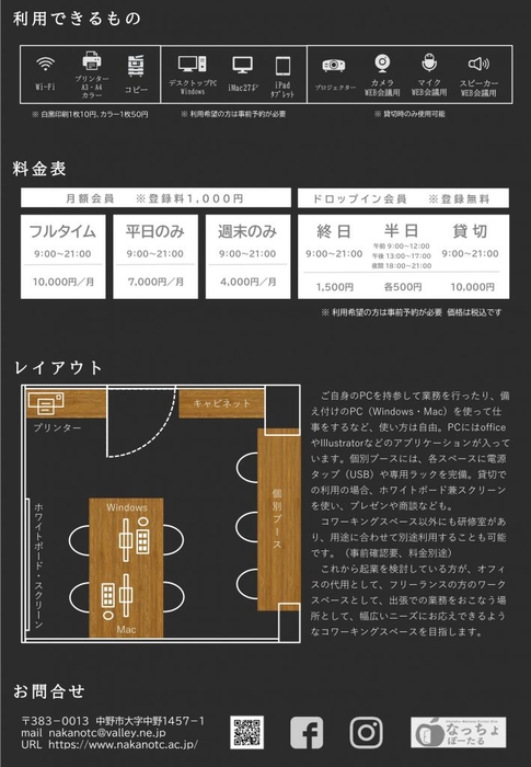 利用形態によって利用料金が異なります。利用できる備品、料金表等詳細は下記のチラシをご確認ください。