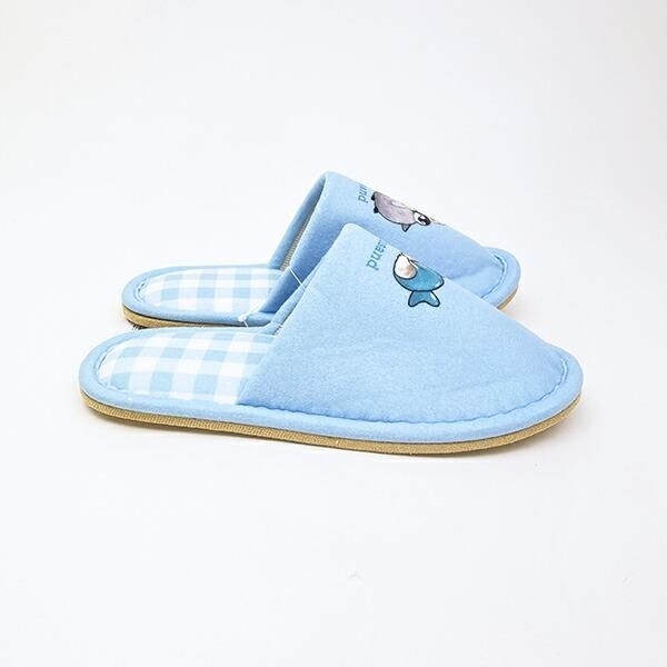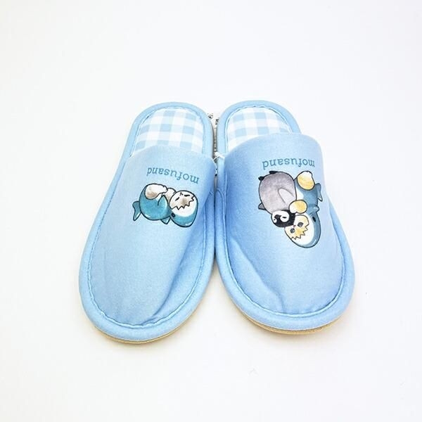 足元までサメにゃんを拝むことができるなんていいのでしょうか、、!!?スリッパには左右それぞれ違ったデザインのサメにゃんが登場。サメにゃんの日常をきりとったような一面にほっこりしてしまいす。また、ブルーチェック柄が清潔感のあるキュート感です。