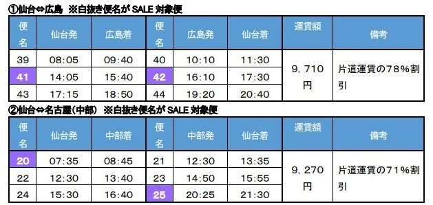 <仙台⇔広島・名古屋3 往復に増便記念SALE 概要>