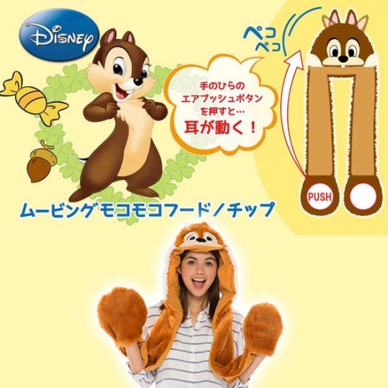 1つ目は、『チップ&デール』のチップのもこもこフードです。手のひら部分あるポンプを押すと、チップの両耳がピクピク動くフードなんですよ!