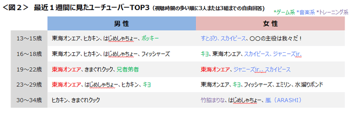 最近1週間にYouTubeで見たユーチューバーを聴取したところ、男性はゲーム系、若年女性は音楽系、30代前半女性はダイエット系の視聴が特徴的。