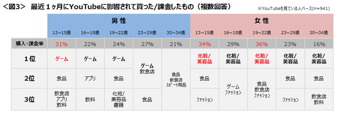 YouTubeに影響された購入・課金率は、1315歳男女と1922歳女性で多く3割を超える。また年代ごとに購入したジャンルをみると、男性はほぼ全年代で1位が「ゲーム」、女性は「化粧/美容品」がランクインした。 <図3>