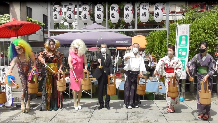 そのキックオフとして、8月6日に露天神社(お初天神)の境内でプロジェクトのご紹介と打ち水を実施し、お初天神の吉沢宮司から曽根崎の魅力をご紹介いただき、プロジェクト応援サポーターであるドラァグクイーンの ベビー・ヴァギーさん、ドリアン・ロロブリジーダさん、オズさんからは応援メッセージをお話しいただきました。