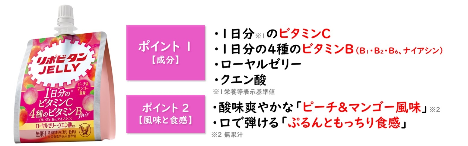 「リポビタンゼリーVC」は、2025年4月8日に登場します。このゼリーには、女性が求めている成分であるビタミンCとビタミンB(B1・B2・B6、ナイアシン)がたっぷり含まれています。食感にもとことんこだわっており、ぷるぷるとした優しい口当たりを実現しました。