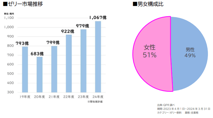 特にビタミン系ゼリーは年々人気が高まっており、2019年と比較すると153%まで伸長しております。また、ゼリーの購入者の50%以上が女性という結果も出ております。
