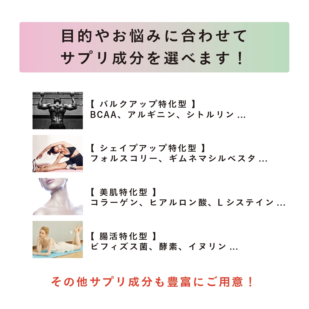 追加栄養素としてBCAAやコラーゲン、酵素などのサプリメント成分も26種類以上を用意しています。