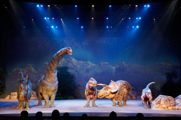 さて、物語にはティラノサウルスやトリケラトプスなど15頭以上の恐竜オールスターが登場。劇場の天井につきそうなほど巨大な全長13mを超えるブラキオサウルスも初登場する。目の前にいる恐竜たちのまばたき、呼吸をするたびに動く胸の動き、舌や尻尾の動きなど実際に見ると、そこに生命を感じることができる。客席内に迫り来る恐竜たちに、一瞬の恐怖のあと、なぜか愛着を覚える。それもまた不思議体験である。