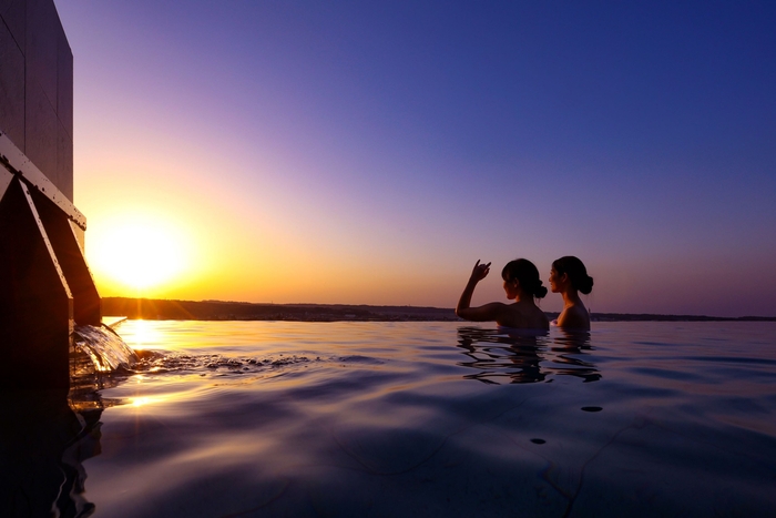 大江戸温泉物語Premium 山下家の天空露天風呂は街並みを一望でき、まるで空に浮かんでいるような感覚を味わえます。きらめく夜景を一望できる夕暮れから夜の時間帯が特におすすめです。