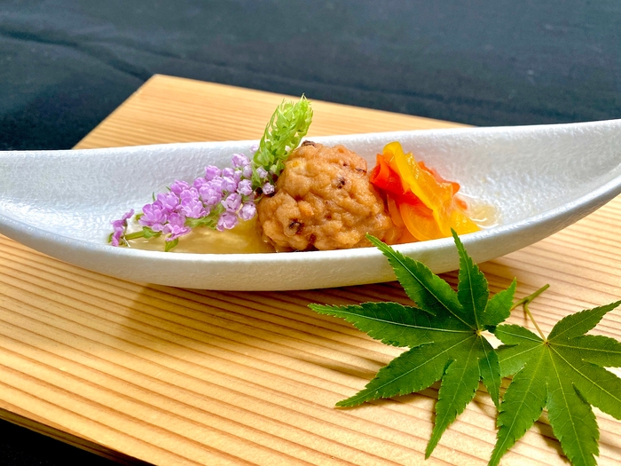 地元でも親しまれている「烏賊メンチ」を会席料理の先付にふさわしい姿に変身させました。刻んだ烏賊とすり身に、すりおろした長いもを加え、より柔らかく仕上げました。油で揚げた後、香味野菜とともに特製の南蛮地(甘酢)に漬け、甘酸っぱい風味を味わえます。南蛮地がよくしみ込んだ、新しい「烏賊メンチ」の魅力を楽しめる一品です。