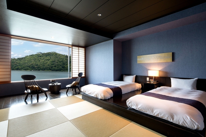全客室に江戸時代から浜松に伝わる伝統工芸「遠州綿紬(めんつむぎ)」を設えています。今では希少となった織物を作り続けている「ぬくもり工房」の作品で、障子やランプシェード、クッションなど、色鮮やかで温かみのある雰囲気が特徴的です。全室から浜名湖の眺望を楽しめ、いたるところにお茶のおもてなしが用意されています。