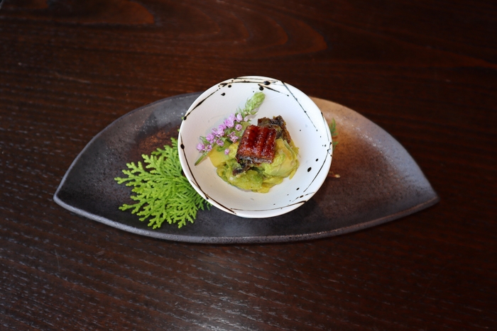 3 会席料理の一品 先付「鰻とアボガドの山葵和え」