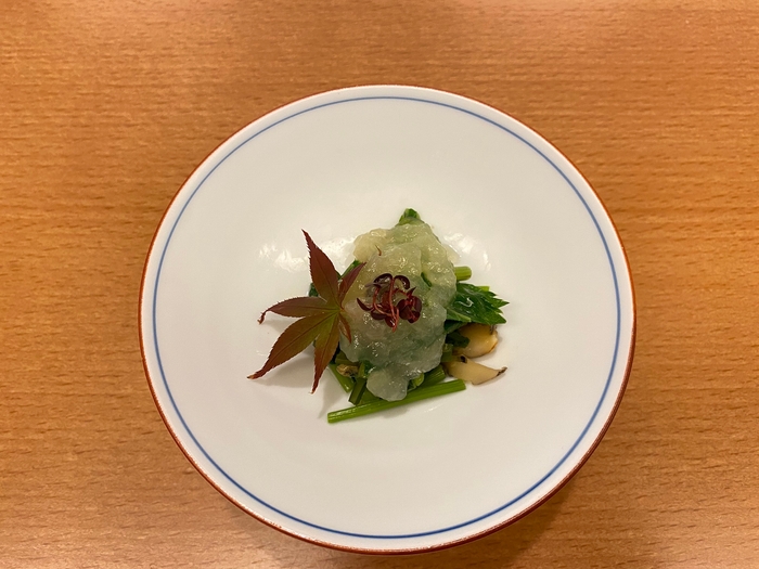 3 会席料理の一品 先付「明日葉と貝わさびのニューサマーオレンジジュレ」