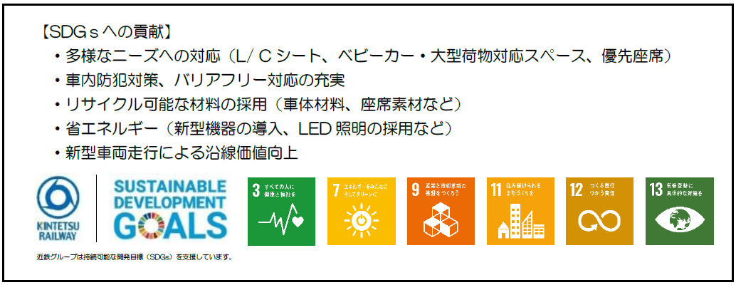 その他、夏期や冬期の車内保温のために、駅に長時間停車する際にお客さまが個別に扉を開閉できるスイッチ(近鉄初 ※ケーブルカーを除く)や、混雑状況に応じてロングシートとクロスシートを切り換えることができるL/C シート、車内防犯対策として防犯カメラの設置、従来車両と比較して消費電力の45%削減など、安全と環境に配慮した車両としています。