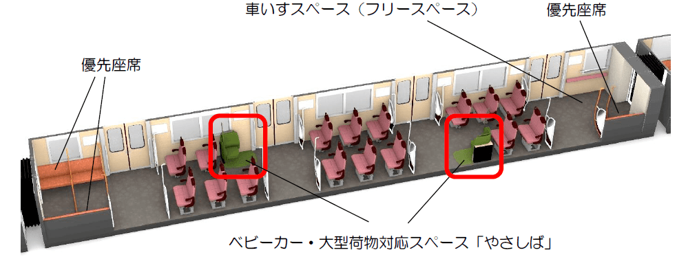 今回の新型一般車両は、ベビーカーや大型荷物などをお持ちのお客さまが気兼ねなく着席して過ごせるスペース「やさしば」を1両あたり2カ所設置するなど、多くのお客さまからのお声を反映した車両としています。
