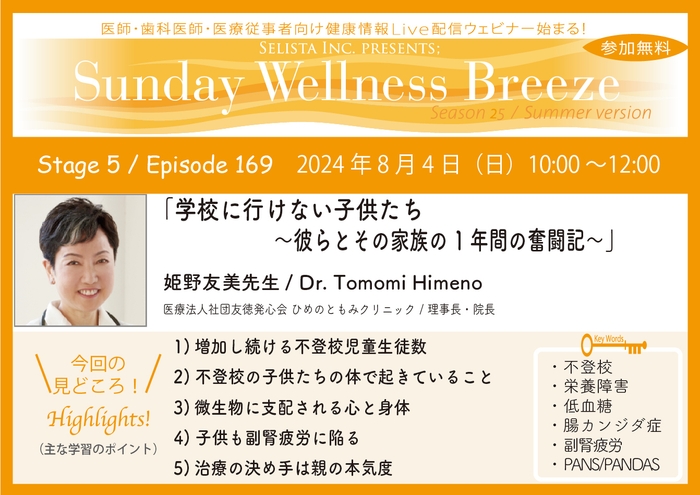 セリスタ株式会社(東京都千代田区、代表取締役:伊藤 承正)は、2024年8月4日(日)に、姫野 友美 先生(ひめのともみクリニック/理事長・院長)を講師にお迎えし、医師・歯科医師などの医療従事者向け無料Zoomオンラインセミナー『学校に行けない子供たち ~彼らとその家族の1年間の奮闘記~』を開催します。
