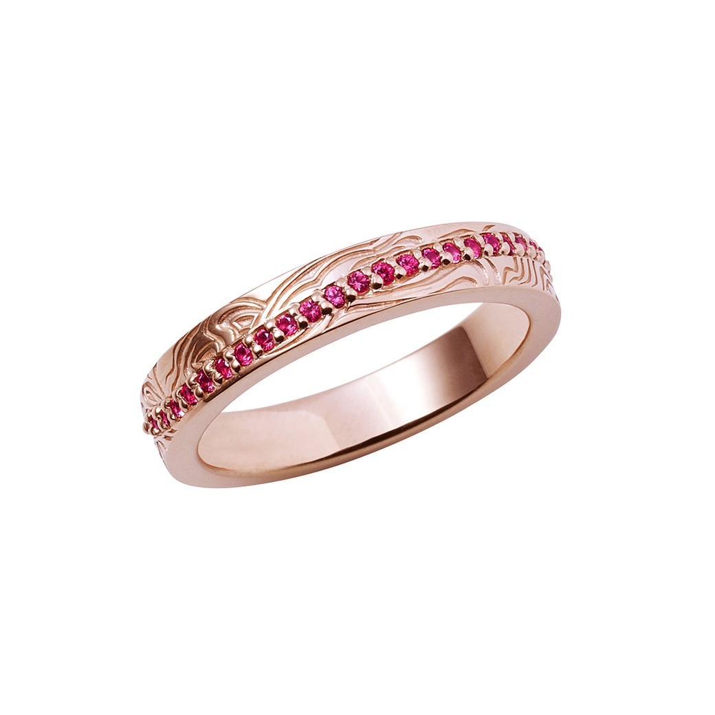 小川の指環(鞭)はレトロなピンクゴールドコーティングを施した木目調のストレート型に、イメージカラーストーンを配しました。和柄で落ち着いた雰囲気のデザインです。