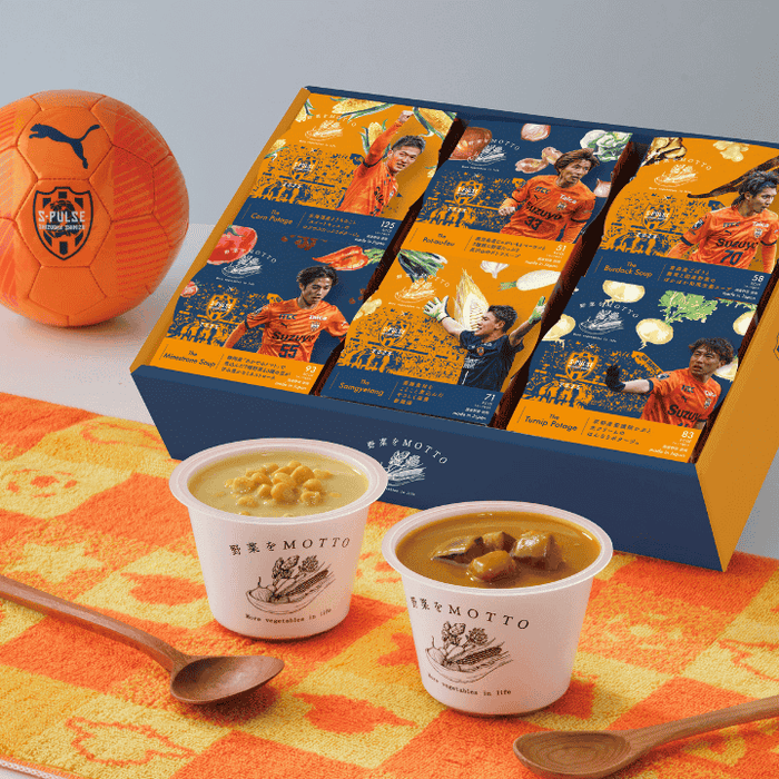 「野菜をMOTTO」の『ベジMOTTOシリーズ』は、国産野菜をたっぷり使った、保存料・着色料不使用のレンジ1分スープ。食卓に彩りと元気を届けるこのスープが、清水エスパルスとコラボすることで、“食べる喜び”と“応援する楽しさ”を同時に味わえるスペシャルセットに仕上がりました。