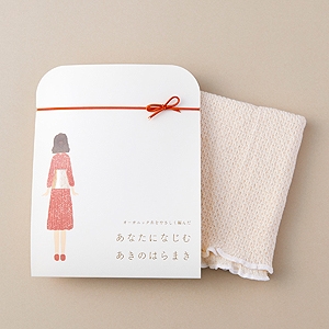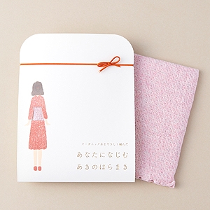 はらまきの色は、無染色・無漂白「きなり」と、植物の天然色素で染めた秋限定カラー「コスモス」の2色です。パッケージには、季節を感じさせる女性のイラストに秋らしい「もみじ」または「オリーブ」色のリボンがついており、プレゼントにも最適です。
