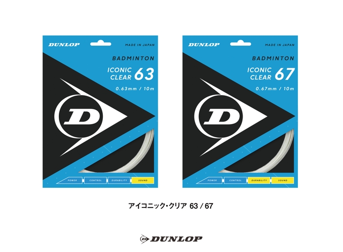 多くのプレーヤーに好まれる心地よい打球感を目指し、ダンロップの「象徴的な」ストリングにしていきたいということ、硬式テニス用のナイロンストリングにも「ICONIC」という名前を採用していることから「ICONIC」と名付けました。また、“CLEARな音を目指して”という思いから「ICONIC CLEAR」とし、後ろの数字については、ストリングの太さ(63=0.63mm、67=0.67mm)をわかりやすく表現しています。
