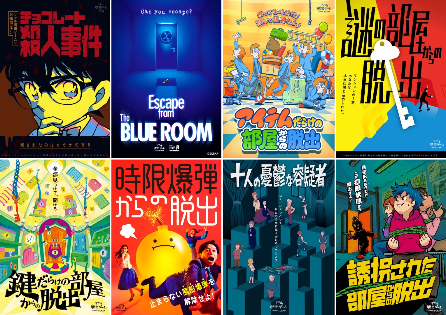 密室から大量の鍵を開けて脱出を目指す『鍵だらけの部屋からの脱出』、参加者1人1人が容疑者となる『十人の憂鬱な容疑者』、SCRAPが初めて作ったルームサイズのリアル脱出ゲーム『謎の部屋からの脱出』と、さまざまなテーマのイベントを楽しむことができます。