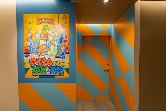 さらに、各イベントの外壁には、それぞれのメインビジュアルを反映した個性的な壁紙が施されています。例えば、青一色で統一された『Escape from The BLUE ROOM』や、水色とオレンジ色の長方形が鮮やかに配置されたインパクト抜群の『アイテムだらけの部屋からの脱出』など、テーマごとの特徴を活かしたデザインが魅力です。イベント参加後は、この壁紙を背景に脱出成功/失敗パネルを手に写真を撮り、ぜひSNSでシェアしてください!