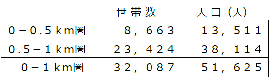 ・店舗から1㎞圏内は単身世帯比率が58.5%、2人世帯比率が22.5%と全体の8割が少人数世帯です。