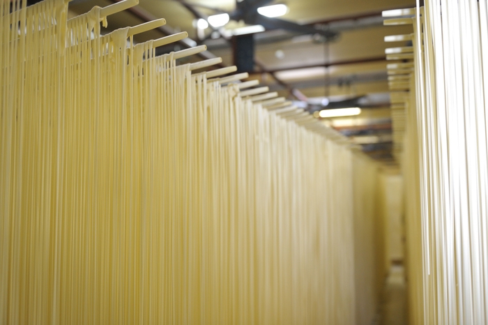 乾燥の際は、他の工程よりもより一層繊細な扱いが必要となります。乾かす時間が短すぎると、乾燥が不十分なため、袋の中で麺がくっついてひとかたまりになってしまいます。逆に乾かす時間が長すぎると、麺が硬くなりすぎてしまうため亀裂が入りやすく、麺が途中で切れ落ちてしまいます。乾燥させながらも中心部の水分は逃がさないために、雨天時以外は窓を開けて自然な風を入れつつ、表面を乾燥機で一気に乾かす。オカベの独自製法が生まれたのはそのような理由からです。最初から最後まで、気を抜くことができない職人技です。