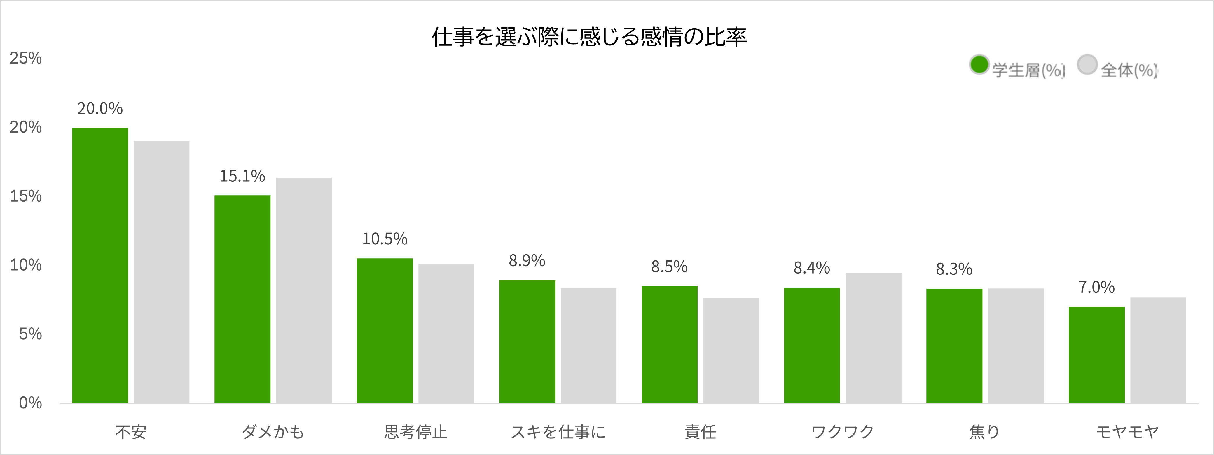 仕事を選ぶことは、若者にとって人生の方向性を決定する重大な局面です。しかし、今回の調査では、仕事を選ぶ際に「不安」を感じる割合が最も高く、学生層では20.0%、社会人層を含めた全体でも19.0%に達しました(以降、()内の数値は回答者全体の割合)。次いで「ダメかも感」が15.1%(16.4%)、「思考停止」が10.5%(10.1%)と続き、ネガティブな心理が強く表れています。一方で、「ワクワク」は8.4%(9.5%)、「好きなことを仕事にしたい」は8.9%(8.4%)、「頑張ればできる」は6.9%(6.4%)と、前向きな感情は相対的に低水準でした。