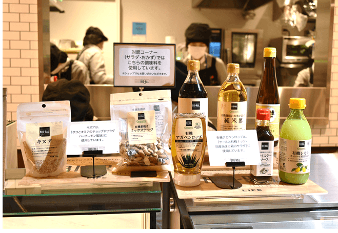 対面コーナーではお好きなメニューをお好みの量ご購入いただけます。オープン時は約18種類もの惣菜が並び、店内で販売している野菜や肉、プライベートブランド「BIO-RAL」の調味料を使用した商品も展開しています。旬やこだわりの素材のおいしさを引き出した味付けがされています。