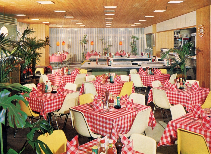 ▲左画像は創業まもないトップスTBS会館店。アメリカンスタイルを取り入れたカウンター席や赤いギンガムチェックのテーブルクロスが特徴。