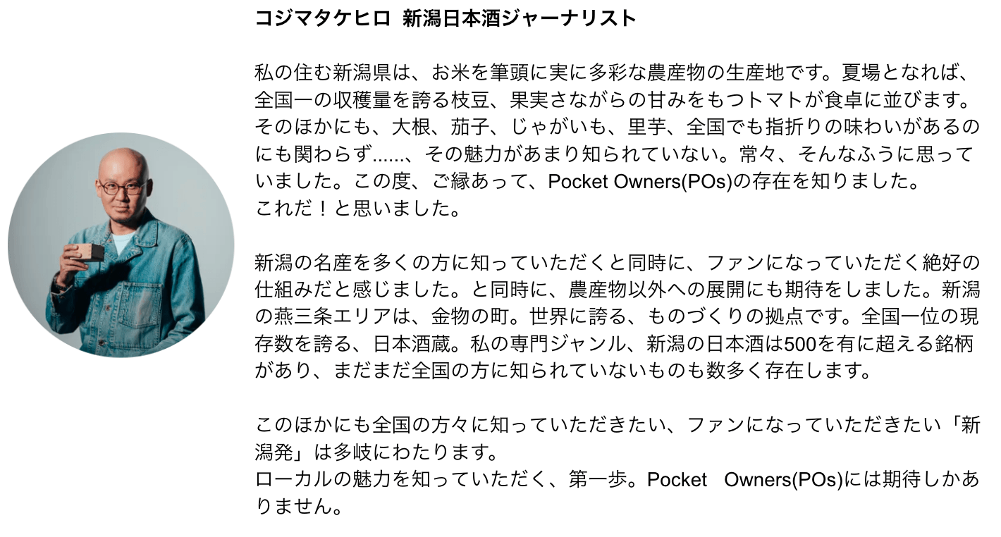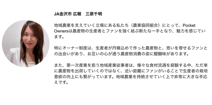 Pocket Owners(ポケット・オーナーズ)は、日本各地の生産物(農産物、水産品、畜産物、加工品、伝統工芸品など)に関して、特定期間の権利上のオーナーになることで、ここでしか得られない様々な特典・体験を得られるサービスです。