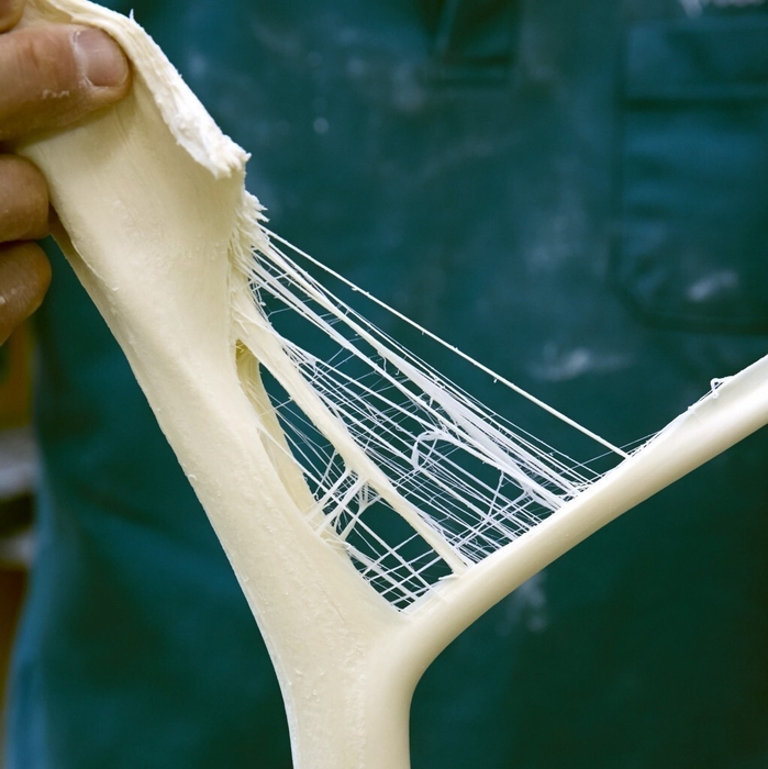 オカベの麺は、3本の帯を1本に、2本の帯を1本にと三つ編みを編んでいくように何度も繰り返し、最終18もの麺の層を作り出します。麺を休ませながらこの工程を丁寧に行うことで、ソフトでありながらもコシの強い麺になります。