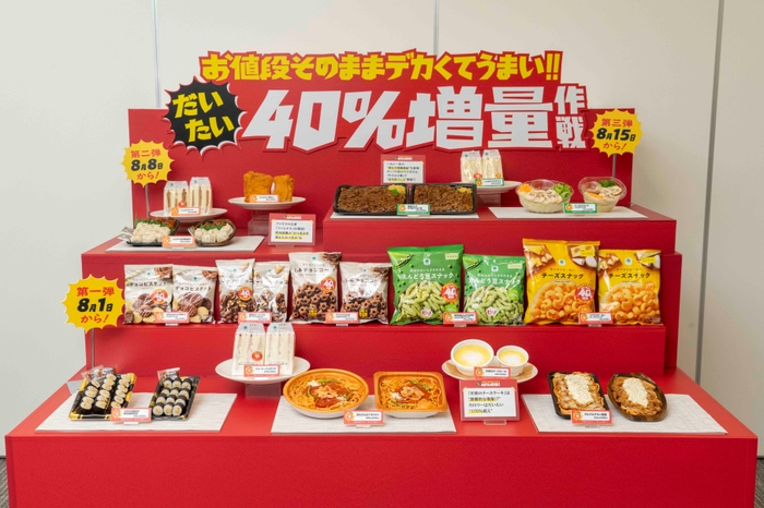 8月1日(火)に発売した「だいたい40%増量」商品は、パーティーや、大人数でのおやつタイムにもぴったりな、チョコレート菓子やスナック菓子に加え、ご飯のお供に嬉しい「タルタルチキン南蛮」や、満腹になる「昔ながらのナポリタン」、ご褒美スイーツとしては大満足な「天使のチーズケーキ」を発売しました。